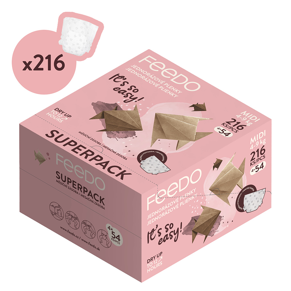 FEEDO Pleny jednorázové MIDI (od 4 do 9 kg), 216 ks, měsíční balení