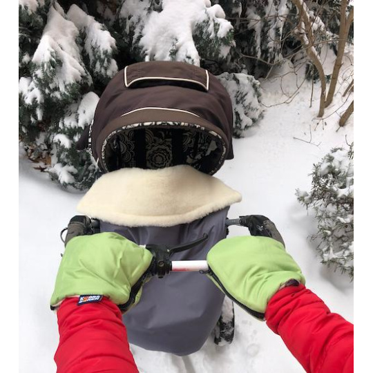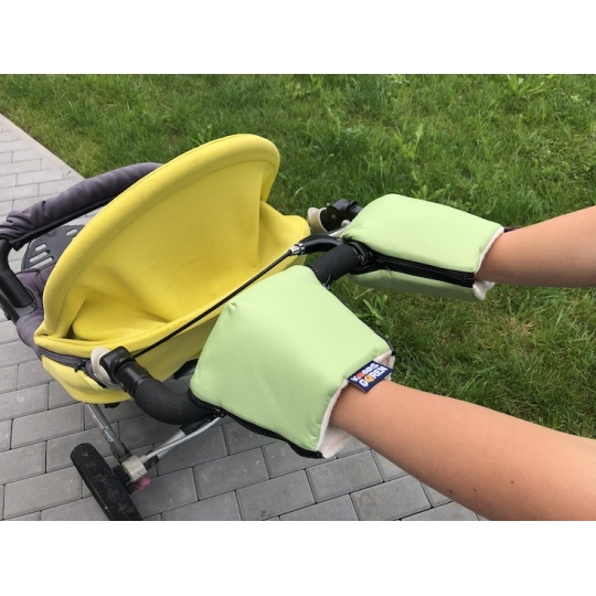 Jeden pár zelených rukavic na všechny typy rukojetí kočárků. Vnější vrstva rukavic je z nepromokavé plášťoviny, uvnitř je vrstva oteplovacího rouna a podšívka je z biobavlny. Biobavlna je vyrobená z GOTS certifikovanej priadze. Na rukojeti v celku se rukavičky navléknou a zapnou se zipy, na oddělené rukojeti golfových kočárků se rukavičky nasadí připraveným otvorem a připevní se gumičkou. Velikost je univerzální, praní na 30 °C, vyrobeno v České republice.