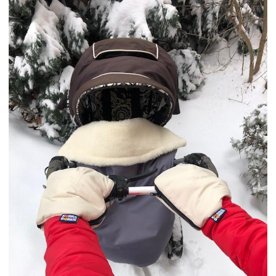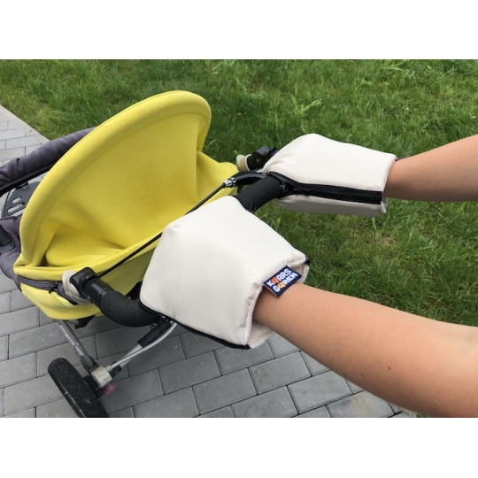 Jeden pár béžových rukavic na všechny typy rukojetí kočárků. Vnější vrstva rukavic je z nepromokavé plášťoviny, uvnitř je vrstva oteplovacího rouna a podšívka je z biobavlny. Biobavlna je vyrobená z GOTS certifikovanej priadze. Na rukojeti v celku se rukavičky navléknou a zapnou se zipy, na oddělené rukojeti golfových kočárků se rukavičky nasadí připraveným otvorem a připevní se gumičkou. Velikost je univerzální, praní na 30 °C, vyrobeno v České republice.