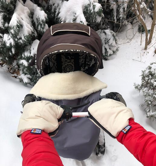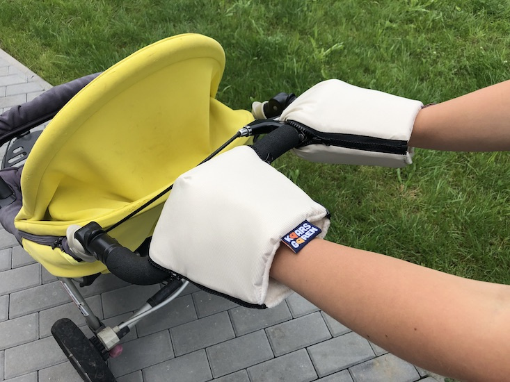 Jeden pár béžových rukavic na všechny typy rukojetí kočárků. Vnější vrstva rukavic je z nepromokavé plášťoviny, uvnitř je vrstva oteplovacího rouna a podšívka je z biobavlny. Biobavlna je vyrobená z GOTS certifikovanej priadze. Na rukojeti v celku se rukavičky navléknou a zapnou se zipy, na oddělené rukojeti golfových kočárků se rukavičky nasadí připraveným otvorem a připevní se gumičkou. Velikost je univerzální, praní na 30 °C, vyrobeno v České republice.