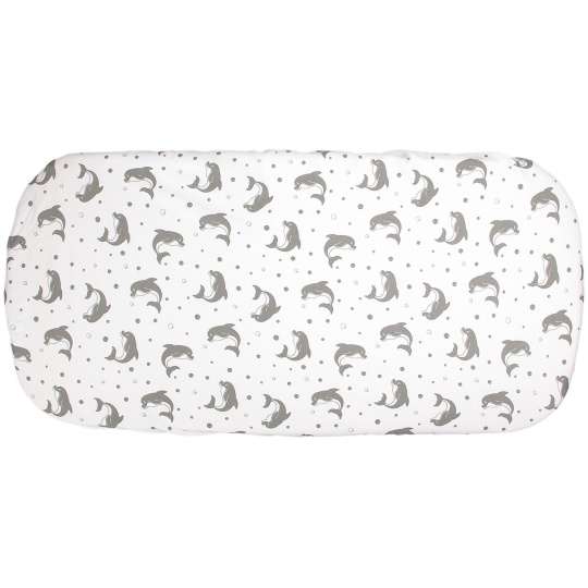 Klasické prostěradlo do kočárku vyrobené ze 100% bio-bavlny s motivem šedých delfínů. Prostěradlo je vhodné na matraci 35 x 75 cm. Praní na 40 °C. Česká výroba.