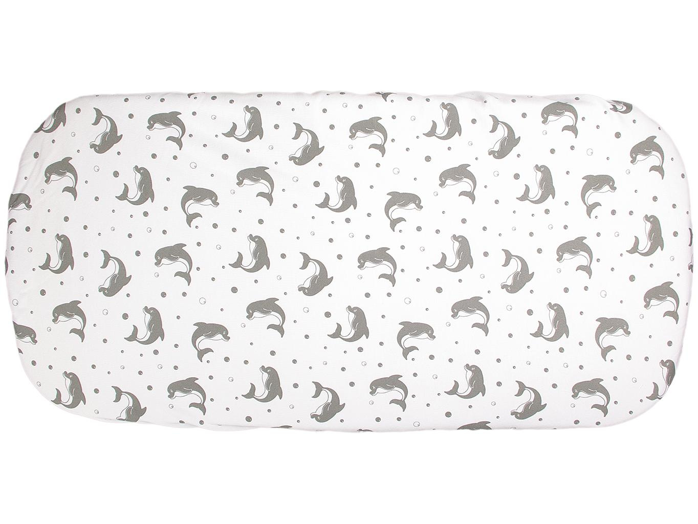 Klasické prostěradlo do kočárku vyrobené ze 100% bio-bavlny s motivem šedých delfínů. Prostěradlo je vhodné na matraci 35 x 75 cm. Praní na 40 °C. Česká výroba.