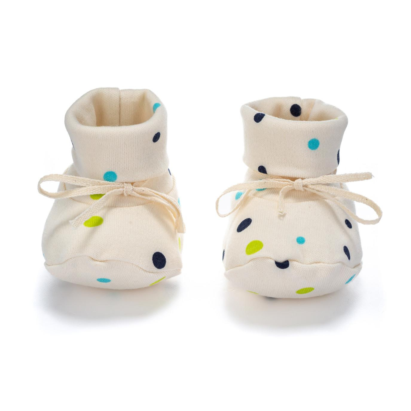 První botičky z bio-bavlny pro novorozené miminko. Velikost botiček je 15 až 17, to je délka chodidla cca 10 cm. Botičky se mohou použít s ponožkami, nebo samostatně místo ponožek. Praní na 40° C. Bio-bavlna je vyrobená z GOTS certifikované příze. Capáčky jsou vyrobené v České republice.