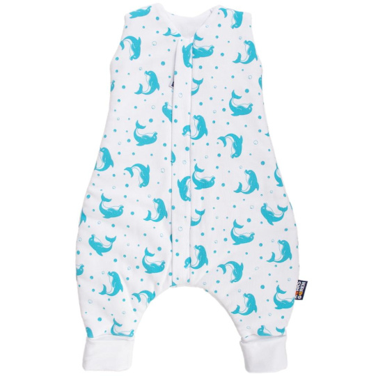 Zateplený nožičkový spací pytel z bio-bavlny v bílé barvě s motivem delfínků v barvě aqua. Délka spacího pytle je cca 60 cm, to je výška dítěte k ramenům. Lze jej prát v pračce při 30 °C. Spací pytel má uprostřed zip a lze jej zcela otevřít v obou směrech. Navíc má zip látkovou krytku, která zabraňuje přiskřípnutí krku do zipu. Spací pytel je ušitý ze tří vrstev: vrchní materiál 100% bio-bavlna, výplň 100% polyester, podšívka 100% bio-bavlna. Česká výroba.
