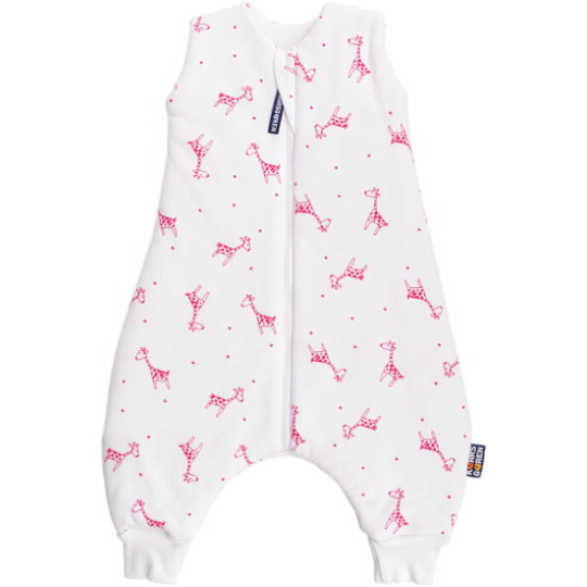 Spací pytel pro novorozené miminko s otvory pro nohy v bílé barvě a s motivem korálově červených žirafek, miminko v něm může volně kopat nožičkami. Délka spacího pytle je cca 60 cm, lze jej prát v pračce při 30 °C. Spací pytel má uprostřed zip a lze jej zcela otevřít, navíc má zip látkovou krytku, která zabraňuje přiskřípnutí krku do zipu. Spací pytel je ušitý ze tří vrstev: vrchní materiál 100% biobavlna, výplň 100% polyester, podšívka 100% biobavlna. Česká výroba.