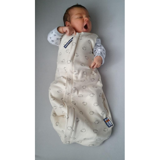 Spací pytel s podšívkou z úpletu z merino vlny. Vnější strana je ze 100% bio-bavlny. Délka spacího pytle je 60 cm - to je délka miminka od ramen k chodidlům. Lze prát v pračce na max 30°C program na vlnu.. Nepoužívat aviváž! Česká výroba.