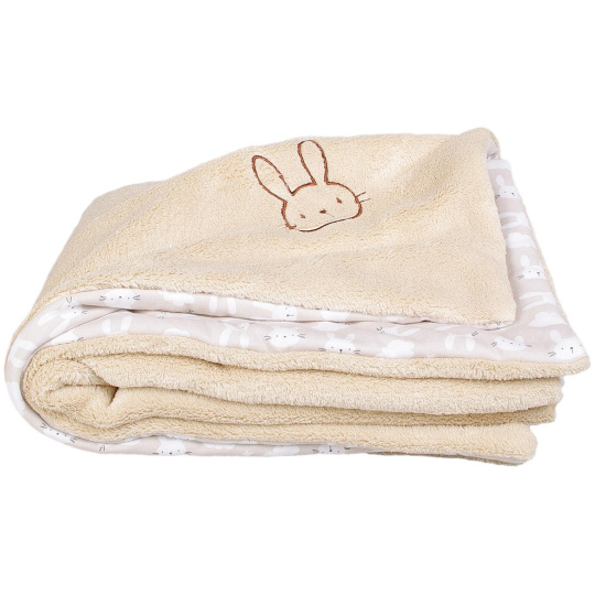 Dětská oboustranná deka z dvou vrstev materiálu Wellsoftu a bavlny. Vrchní strana je z béžového Wellsoftu (100% polyester) s výšivkou zajíčka a spodní strana je ze 100% bavlny s potiskem zajíčků a obláčků. Rozměr deky je 70 x 100 cm. Praní na 30 °C. Vyrobeno v ČR.