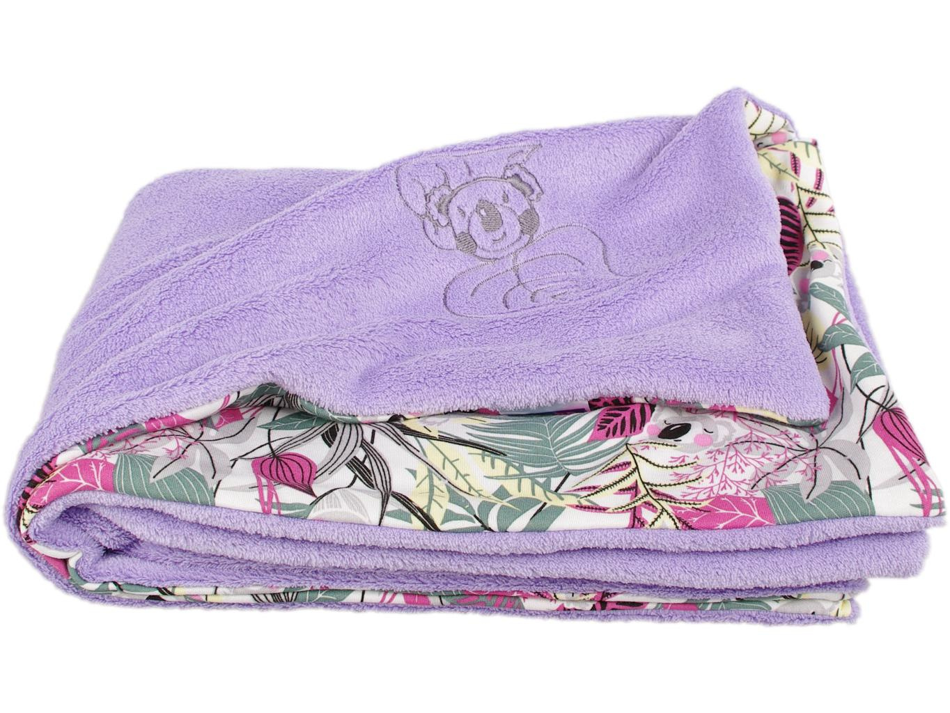 Dětská oboustranná deka z dvou vrstev materiálu Wellsoftu a bavlny. Vrchní strana je z Wellsoftu (100% polyester) ve fialové barvě s výšivkou koaly a spodní strana je ze 100% bavlny s potiskem koal. Rozměr deky je 70 x 100 cm. Praní na 30 °C. Vyrobeno v ČR.