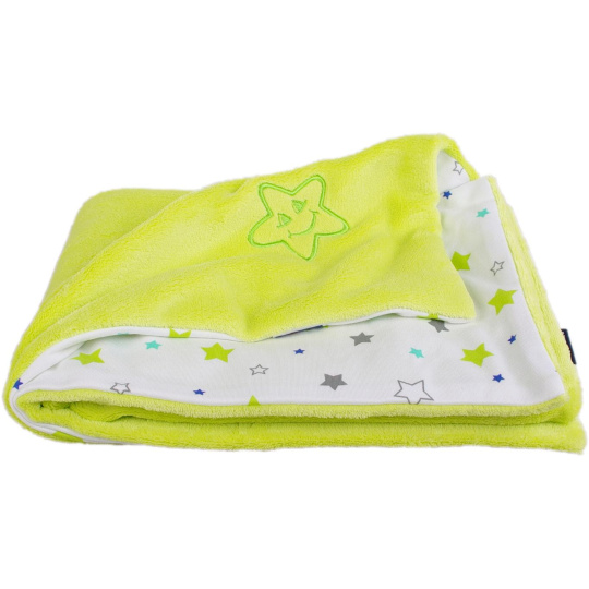 Dětská oboustranná deka z dvou vrstev materiálu Wellsoftu a bio-bavlny. Vrchní strana je z Wellsoftu (100% polyester) v limetkové barvě s výšivkou hvězdičky a spodní strana je ze 100% bio-bavlny s potiskem hvězdiček na bílé. Rozměr deky je 70 x 100 cm. Praní na 30 °C. Vyrobeno v ČR.