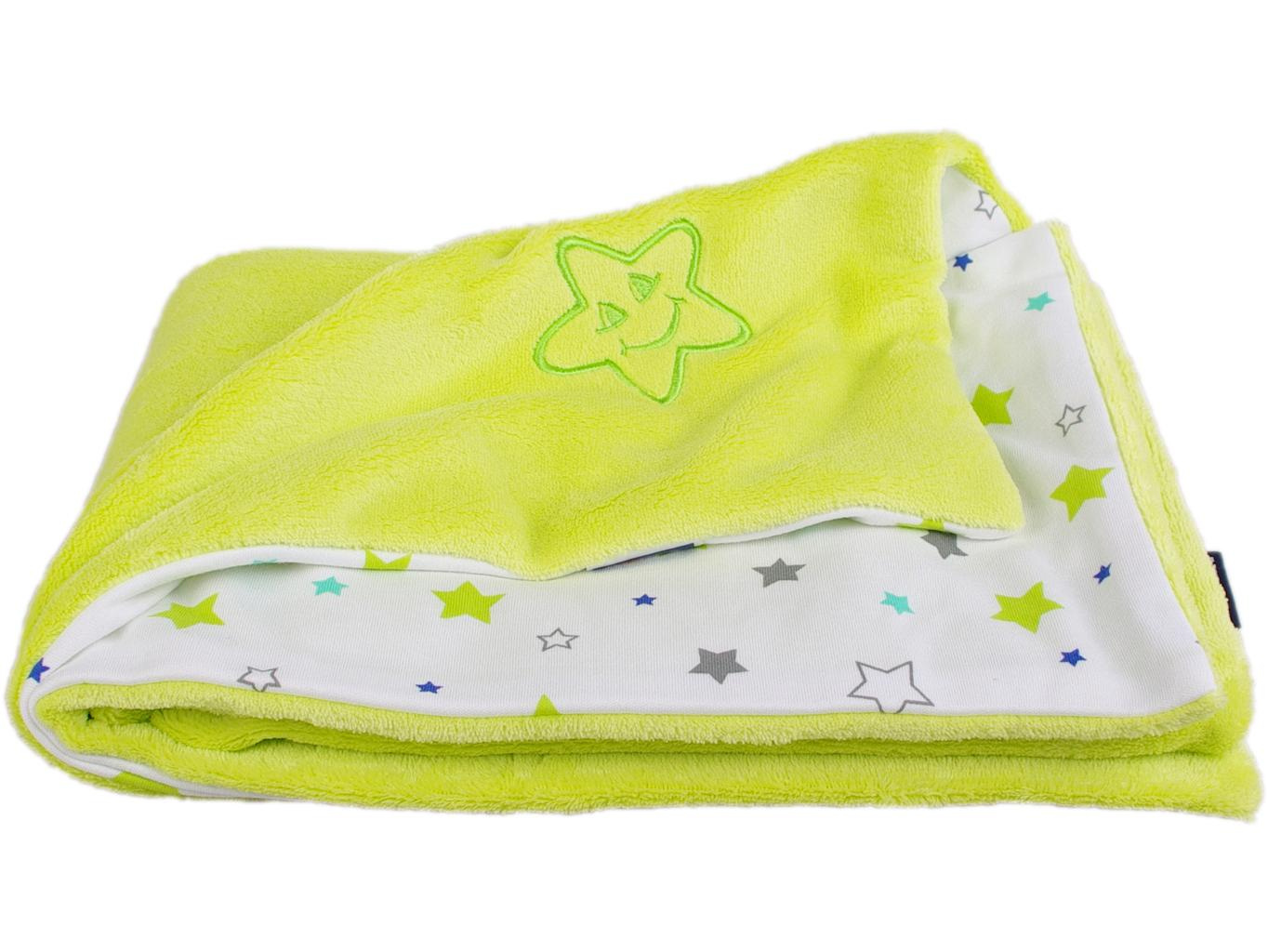 Dětská oboustranná deka z dvou vrstev materiálu Wellsoftu a bio-bavlny. Vrchní strana je z Wellsoftu (100% polyester) v limetkové barvě s výšivkou hvězdičky a spodní strana je ze 100% bio-bavlny s potiskem hvězdiček na bílé. Rozměr deky je 70 x 100 cm. Praní na 30 °C. Vyrobeno v ČR.