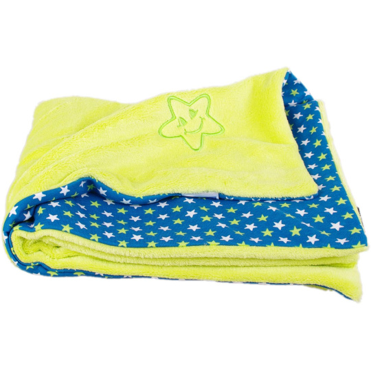 Dětská oboustranná deka z dvou vrstev materiálu Wellsoftu a bavlny. Vrchní strana je z limetkového Wellsoftu (100% polyester) s výšivkou hvězdičky a spodní strana je ze 100% bavlny s potiskem hvězdiček na petrolejové modré. Rozměr deky je 70 x 100 cm. Praní na 30 °C. Vyrobeno v ČR.