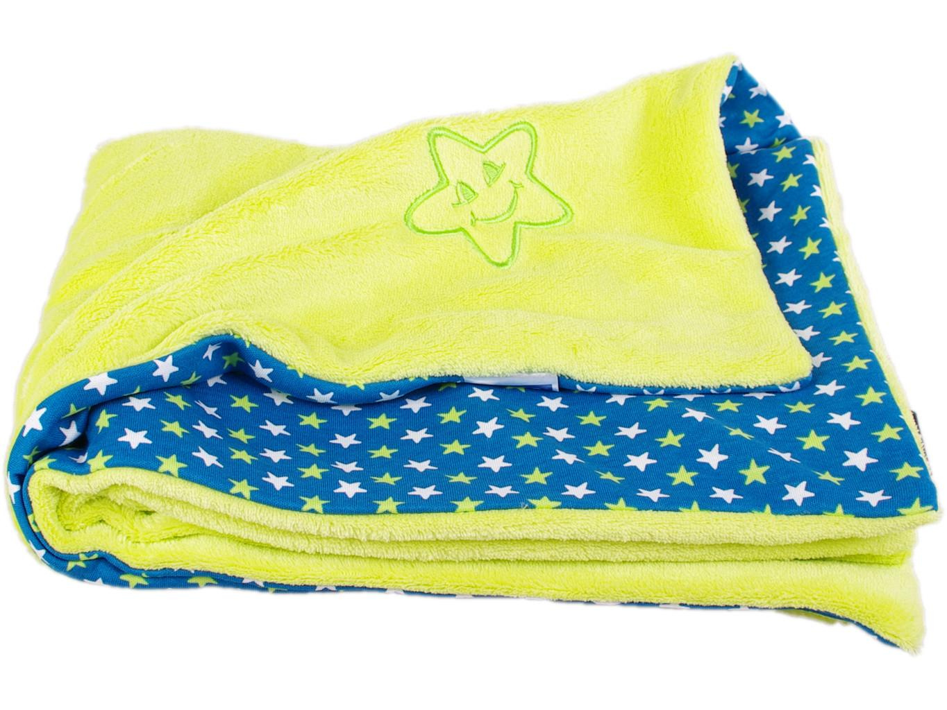 Dětská oboustranná deka z dvou vrstev materiálu Wellsoftu a bavlny. Vrchní strana je z limetkového Wellsoftu (100% polyester) s výšivkou hvězdičky a spodní strana je ze 100% bavlny s potiskem hvězdiček na petrolejové modré. Rozměr deky je 70 x 100 cm. Praní na 30 °C. Vyrobeno v ČR.