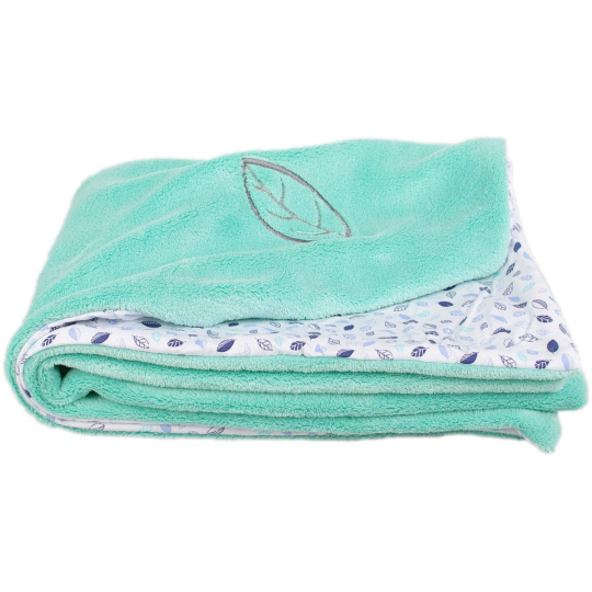 Dětská oboustranná deka z dvou vrstev materiálu Wellsoftu a bavlny. Vrchní strana je z mentolového Wellsoftu (100% polyester) s výšivkou listu a spodní strana je ze 100% bavlny s potiskem lístečků. Rozměr deky je 70 x 100 cm. Praní na 30 °C. Vyrobeno v ČR.