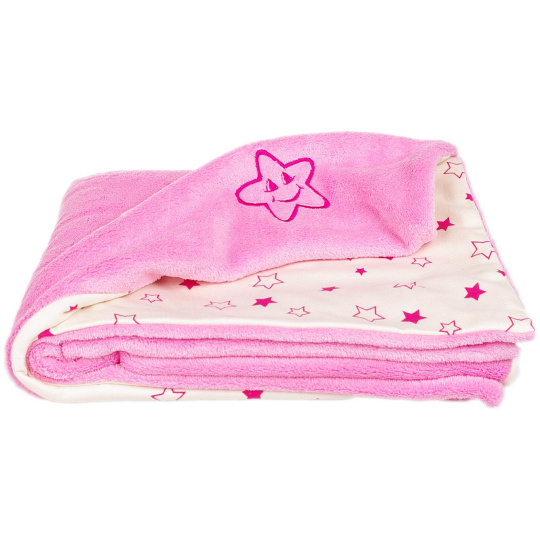 Dětská oboustranná deka z dvou vrstev materiálu Wellsoftu a bio-bavlny. Vrchní strana je z Wellsoftu (100% polyester) v růžové barvě s výšivkou hvězdičky a spodní strana je ze 100% bio-bavlny s potiskem růžových hvězdiček. Rozměr deky je 70 x 100 cm. Praní na 30 °C. Vyrobeno v ČR.