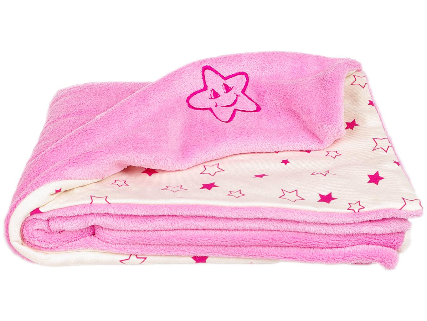 Dětská oboustranná deka z dvou vrstev materiálu Wellsoftu a bio-bavlny. Vrchní strana je z Wellsoftu (100% polyester) v růžové barvě s výšivkou hvězdičky a spodní strana je ze 100% bio-bavlny s potiskem růžových hvězdiček. Rozměr deky je 70 x 100 cm. Praní na 30 °C. Vyrobeno v ČR.
