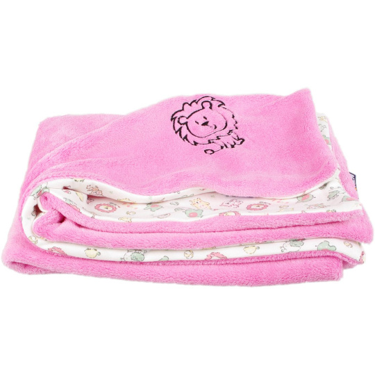 Dětská oboustranná deka z dvou vrstev materiálu Wellsoftu a bavlny. Vrchní strana je z růžového Wellsoftu (100% polyester) s výšivkou lva a spodní strana je ze 100% bavlny s potiskem zvířátek v růžové barvě. Rozměr deky je 70 x 100 cm. Praní na 30 °C. Vyrobeno v ČR.