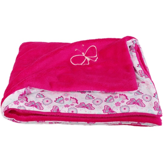 Dětská oboustranná deka z dvou vrstev materiálu Wellsoftu a bavlny. Vrchní strana je z růžového Wellsoftu (100% polyester) s výšivkou motýla a spodní strana je ze 100% bavlny s potiskem motýlků. Rozměr deky je 70 x 100 cm. Praní na 30 °C. Vyrobeno v ČR.