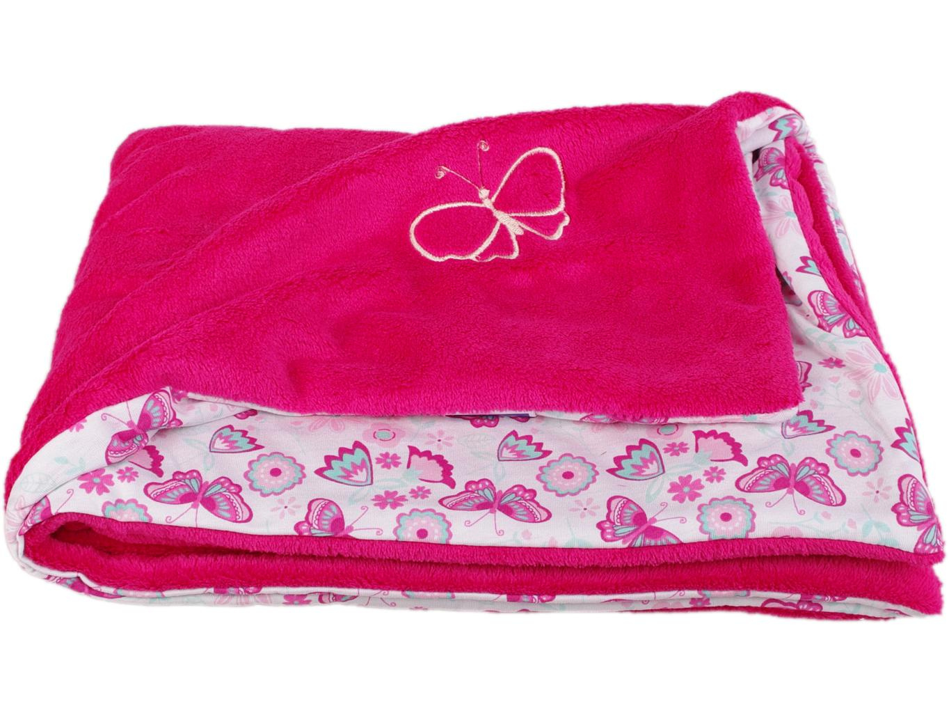 Dětská oboustranná deka z dvou vrstev materiálu Wellsoftu a bavlny. Vrchní strana je z růžového Wellsoftu (100% polyester) s výšivkou motýla a spodní strana je ze 100% bavlny s potiskem motýlků. Rozměr deky je 70 x 100 cm. Praní na 30 °C. Vyrobeno v ČR.