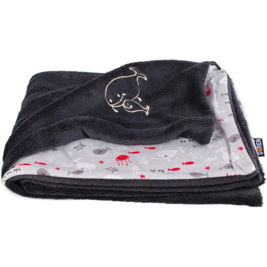 Dětská oboustranná deka z dvou vrstev materiálu Wellsoftu a bavlny. Vrchní strana je z šedého Wellsoftu (100% polyester) s výšivkou rybiček a spodní strana je ze 100% bavlny s potiskem mořského světa. Rozměr deky je 70 x 100 cm. Praní na 30 °C. Vyrobeno v ČR.