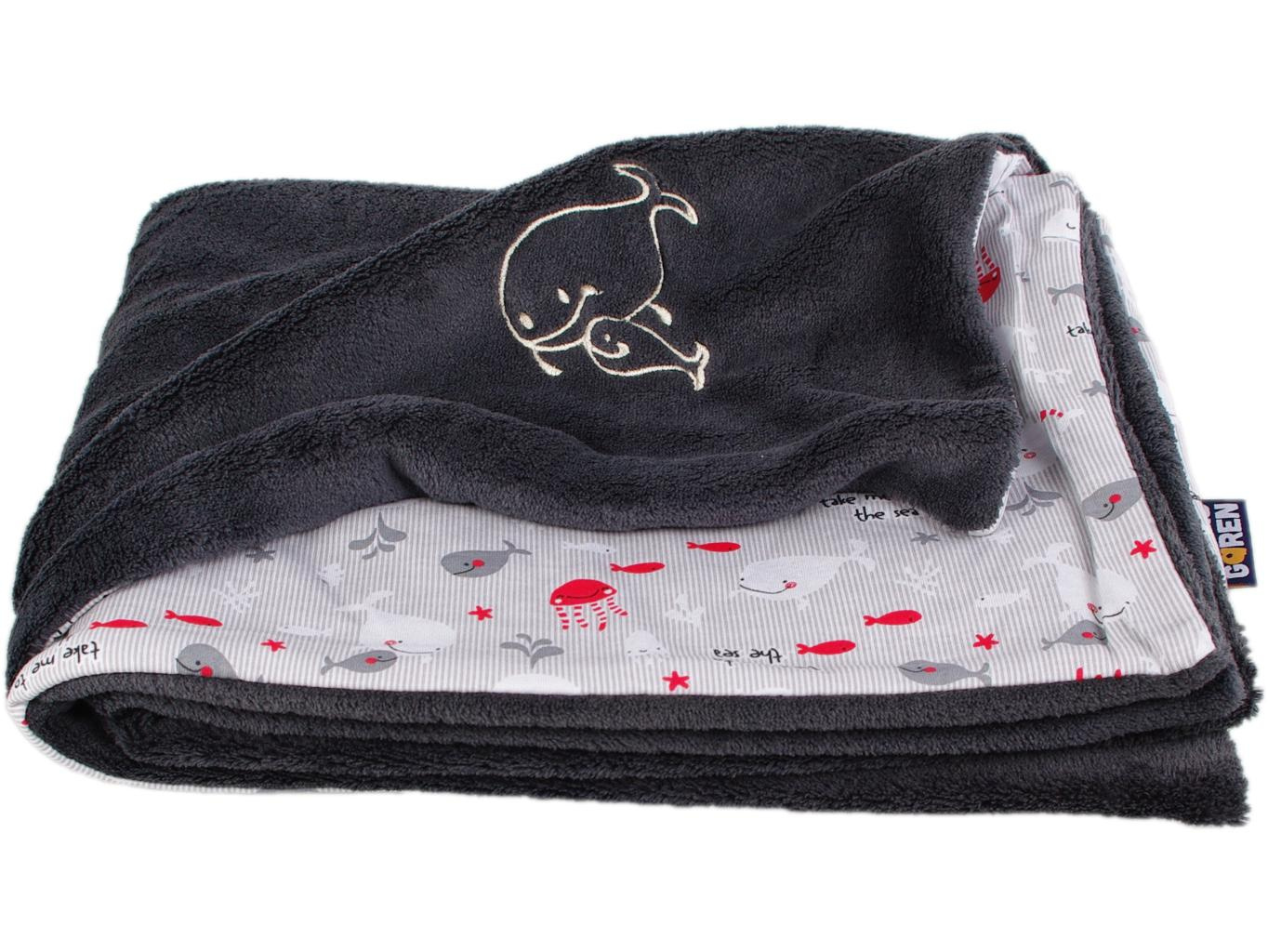 Dětská oboustranná deka z dvou vrstev materiálu Wellsoftu a bavlny. Vrchní strana je z šedého Wellsoftu (100% polyester) s výšivkou rybiček a spodní strana je ze 100% bavlny s potiskem mořského světa. Rozměr deky je 70 x 100 cm. Praní na 30 °C. Vyrobeno v ČR.
