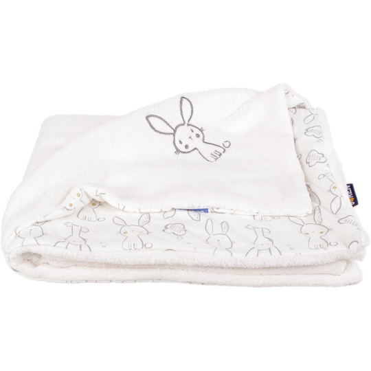 Dětská oboustranná deka z dvou vrstev materiálu Wellsoftu a bavlny. Vrchní strana je ze smetanového Wellsoftu (100% polyester) s výšivkou zajíčka a spodní strana je ze 100% bavlny s potiskem zajíčků. Rozměr deky je 70 x 100 cm. Praní na 30 °C. Vyrobeno v ČR.