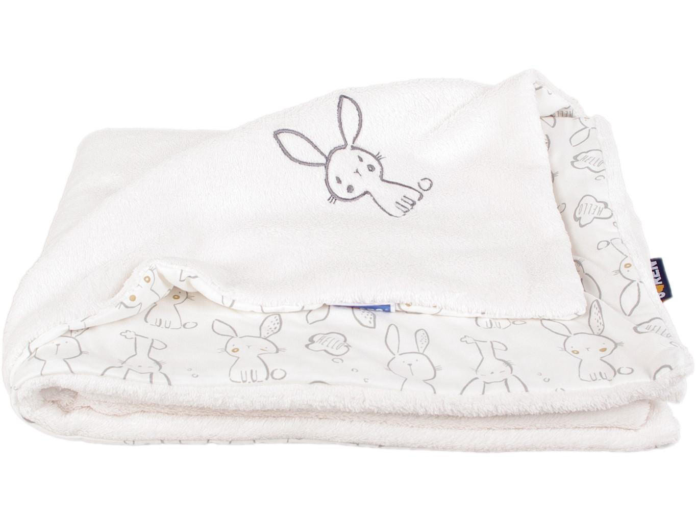 Dětská oboustranná deka z dvou vrstev materiálu Wellsoftu a bavlny. Vrchní strana je ze smetanového Wellsoftu (100% polyester) s výšivkou zajíčka a spodní strana je ze 100% bavlny s potiskem zajíčků. Rozměr deky je 70 x 100 cm. Praní na 30 °C. Vyrobeno v ČR.