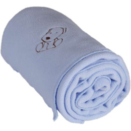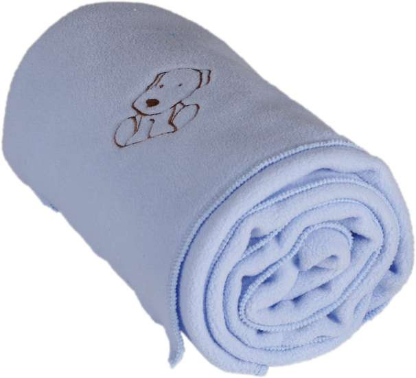 Modrá deka s výšivkou pejska. Deka je vyrobená z fleece materiálu (100% polyester), její rozměr je 70 x 100 cm. Praní na 30° C. Česká výroba.