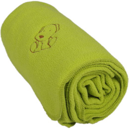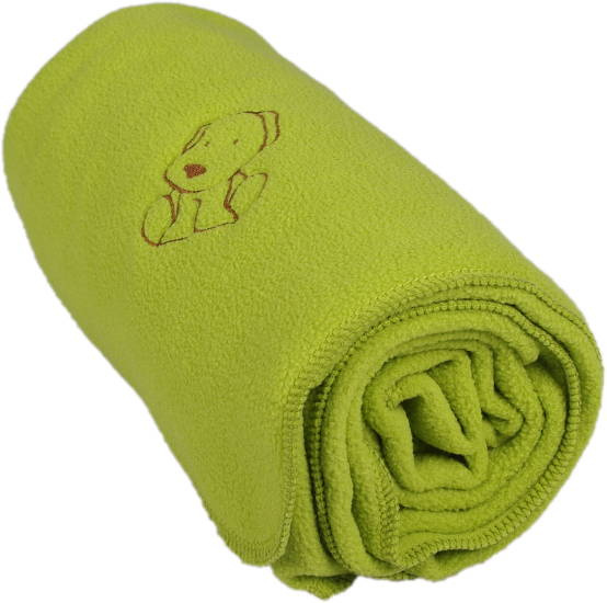 Zelená deka s výšivkou pejska. Deka je vyrobená z fleece materiálu (100% polyester), její rozměr je 70 x 100 cm. Praní na 30° C. Česká výroba.