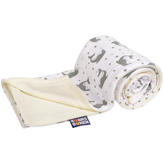 Oboustranná dětská deka z bio-bavlny a merino vlny s motivem šedých delfínů. Vrchní strana je ze 100% bio-bavlny a podšívka z úpletu ze 100% merino vlny. Gramáž merina je 200g/m2, 100% MERINO extra 18,5 µm. Deka má velikost cca 70 x 100 cm. Praní na 30° C. Nepoužívat aviváž! Česká výroba.