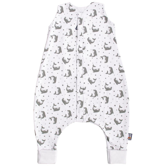 Dětský letní spací pytel s nožičkami v bílé barvě s motivem šedých delfínků. Délka spacího pytle je cca 100 cm, lze jej prát v pračce při 40 °C. Spací pytel má uprostřed zip a lze jej zcela otevřít, navíc má zip látkovou krytku, která zabraňuje přiskřípnutí krku do zipu. Spací pytel je ušitý ze dvou vrstev: vrchní materiál 100% bio-bavlna, podšívka 100% bio-bavlna. Česká výroba.