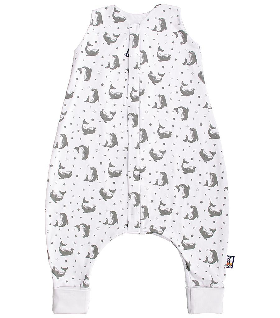 Dětský letní spací pytel s nožičkami v bílé barvě s motivem delfínků v šedé barvě, miminko v něm může volně kopat nožičkami. Délka spacího pytle je cca 60 cm, lze jej prát v pračce při 40 °C. Spací pytel má uprostřed zip a lze jej zcela otevřít, navíc má zip látkovou krytku, která zabraňuje přiskřípnutí krku do zipu. Spací pytel je ušitý ze dvou vrstev: vrchní materiál 100% biobavlna, podšívka 100% biobavlna. Česká výroba.