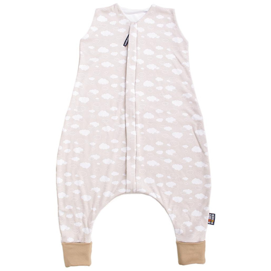 Letní dětský spací pytel s nohavicemi béžový s motivem obláčků, dítě v něm může volně kopat nožičkami. Délka spacího pytle je cca 100 cm, lze jej prát v pračce při 30 °C. Délka spacího pytle odpovídá výšce dítěte k ramenům. Spací pytel má uprostřed zip a lze jej zcela otevřít, navíc má zip látkovou krytku, která zabraňuje přiskřípnutí krku do zipu. Spací pytel je ušitý ze dvou vrstev: vrchní materiál 100% bavlna, podšívka 100% bambusová viskóza. Česká výroba.