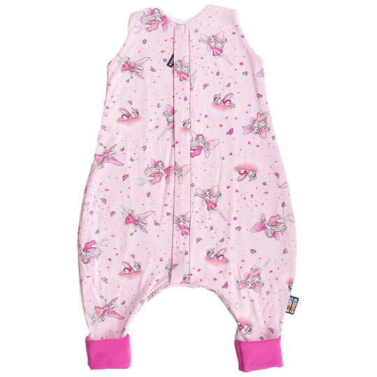 Letní spací pytel pro novorozené miminko s otvory pro nohy v růžové barvě a s motivem víl, miminko v něm může volně kopat nožičkami. Délka spacího pytle je cca 60 cm, lze jej prát v pračce při 30 °C. Délka spacího pytle odpovídá výšce dítěte k ramenům. Spací pytel má uprostřed zip a lze jej zcela otevřít, navíc má zip látkovou krytku, která zabraňuje přiskřípnutí krku do zipu. Spací pytel je ušitý ze dvou vrstev: vrchní materiál 100% bavlna, podšívka 100% bambusová viskóza. Česká výroba.