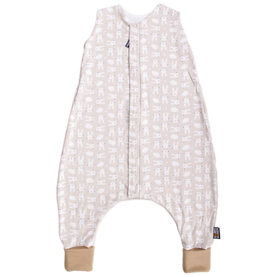 Letní dětský spací pytel s nohavicemi béžový s motivem zajíčků a obláčků, dítě v něm může volně kopat nožičkami. Délka spacího pytle je cca 80 cm, lze jej prát v pračce při 30 °C. Délka spacího pytle odpovídá výšce dítěte k ramenům. Spací pytel má uprostřed zip a lze jej zcela otevřít, navíc má zip látkovou krytku, která zabraňuje přiskřípnutí krku do zipu. Spací pytel je ušitý ze dvou vrstev: vrchní materiál 100% bavlna, podšívka 100% bambusová viskóza. Česká výroba.