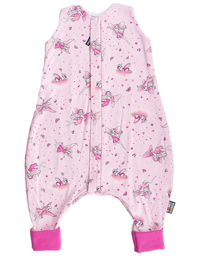 Letní dětský spací pytel s otvory pro nohy v růžové barvě a s motivem víl, dítě v něm může volně kopat nožičkami. Délka spacího pytle je cca 80 cm, lze jej prát v pračce při 30 °C. Délka spacího pytle odpovídá výšce dítěte k ramenům. Spací pytel má uprostřed zip a lze jej zcela otevřít, navíc má zip látkovou krytku, která zabraňuje přiskřípnutí krku do zipu. Spací pytel je ušitý ze dvou vrstev: vrchní materiál 100% bavlna, podšívka 100% bambusová viskóza. Česká výroba.