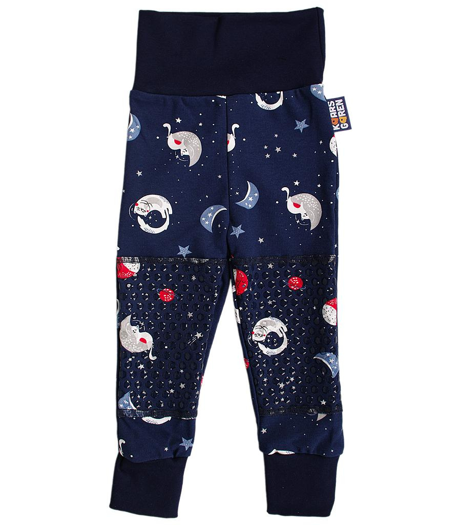 Dětské kalhoty ve velikosti 74 s protiskluzovou vrstvou na kolenou pro pohodlné lezení v interiéru. Když děti začínají lézt, jsou nestabilní a na plovoucí podlaze, nebo na linu jim to klouže a mohou se uhodit. Protiskluzová vrstva na kolenou jim pomůže zajistit stabilitu. Kalhoty mají lem v pase i na nohavicích a přehnutím, nebo natažením je lze používat delší dobu než kalhoty klasické - vydrží i přes dvě velikosti. Kalhoty jsou vyrobené v ČR z bavlny. Lze je prát otočené naruby v pračce při 40 °C, protiskluzová kolena se nesmí žehlit.