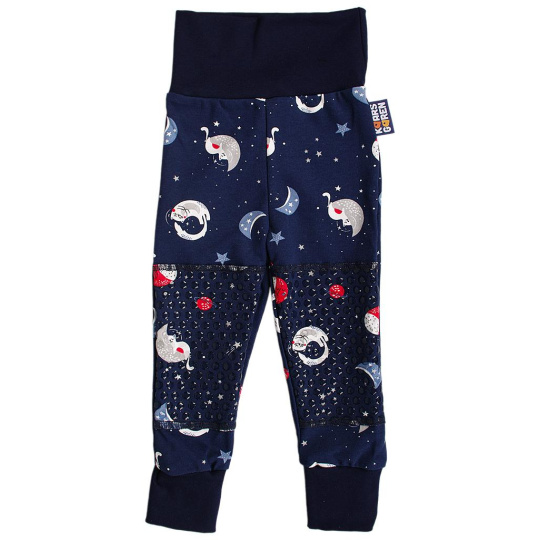 Dětské kalhoty ve velikosti 68 s protiskluzovou vrstvou na kolenou pro pohodlné lezení v interiéru. Když děti začínají lézt, jsou nestabilní a na plovoucí podlaze, nebo na linu jim to klouže a mohou se uhodit. Protiskluzová vrstva na kolenou jim pomůže zajistit stabilitu. Kalhoty mají lem v pase i na nohavicích a přehnutím, nebo natažením je lze používat delší dobu než kalhoty klasické - vydrží i přes dvě velikosti. Kalhoty jsou vyrobené v ČR z bavlny. Lze je prát otočené naruby v pračce při 40 °C, protiskluzová kolena se nesmí žehlit.
