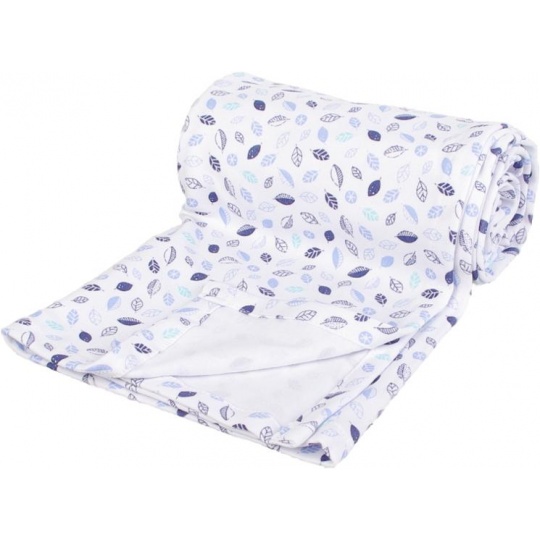 Lehká letní deka pro větší děti, deka je ze 100% bavlny, je bílá s motivem modrých lístečků. Rozměr deky je cca 100 x 150 cm, lze prát na 40 °C. Česká výroba.