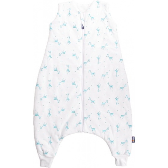 Dětský letní spací pytel s otvory pro nohy v bílé barvě s motivem žirafek v barvě aqua. Délka spacího pytle je cca 100 cm, lze jej prát v pračce při 30 °C. Spací pytel má uprostřed zip a lze jej zcela otevřít, navíc má zip látkovou krytku, která zabraňuje přiskřípnutí krku do zipu. Spací pytel je ušitý ze dvou vrstev: vrchní materiál 100% biobavlna, podšívka 100% biobavlna. Česká výroba.