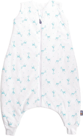 Dětský letní spací pytel s otvory pro nohy v bílé barvě s motivem žirafek v barvě aqua. Délka spacího pytle je cca 100 cm, lze jej prát v pračce při 30 °C. Spací pytel má uprostřed zip a lze jej zcela otevřít, navíc má zip látkovou krytku, která zabraňuje přiskřípnutí krku do zipu. Spací pytel je ušitý ze dvou vrstev: vrchní materiál 100% biobavlna, podšívka 100% biobavlna. Česká výroba.