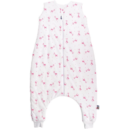 Dětský letní spací pytel s otvory pro nohy v bílé barvě s motivem červených žirafek. Délka spacího pytle je cca 110 cm, lze jej prát v pračce při 30 °C. Spací pytel má uprostřed zip a lze jej zcela otevřít, navíc má zip látkovou krytku, která zabraňuje přiskřípnutí krku do zipu. Spací pytel je ušitý ze dvou vrstev: vrchní materiál 100% biobavlna, podšívka 100% biobavlna. Česká výroba.