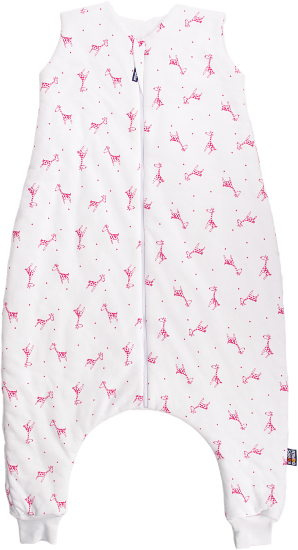 Dětský letní spací pytel s otvory pro nohy v bílé barvě s motivem červených žirafek. Délka spacího pytle je cca 110 cm, lze jej prát v pračce při 30 °C. Spací pytel má uprostřed zip a lze jej zcela otevřít, navíc má zip látkovou krytku, která zabraňuje přiskřípnutí krku do zipu. Spací pytel je ušitý ze dvou vrstev: vrchní materiál 100% biobavlna, podšívka 100% biobavlna. Česká výroba.