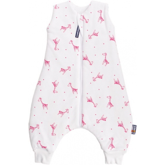 Letní spací pytel pro novorozené miminko s otvory pro nohy v bílé barvě s motivem červených žirafek, miminko v něm může volně kopat nožičkami. Délka spacího pytle je cca 60 cm, lze jej prát v pračce při 30 °C. Spací pytel má uprostřed zip a lze jej zcela otevřít, navíc má zip látkovou krytku, která zabraňuje přiskřípnutí krku do zipu. Spací pytel je ušitý ze dvou vrstev: vrchní materiál 100% biobavlna, podšívka 100% biobavlna. Česká výroba.