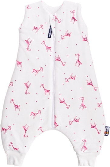 Letní spací pytel pro novorozené miminko s otvory pro nohy v bílé barvě s motivem červených žirafek, miminko v něm může volně kopat nožičkami. Délka spacího pytle je cca 60 cm, lze jej prát v pračce při 30 °C. Spací pytel má uprostřed zip a lze jej zcela otevřít, navíc má zip látkovou krytku, která zabraňuje přiskřípnutí krku do zipu. Spací pytel je ušitý ze dvou vrstev: vrchní materiál 100% biobavlna, podšívka 100% biobavlna. Česká výroba.