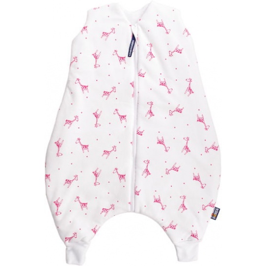 Letní spací pytel pro miminko s otvory pro nohy v bílé barvě s motivem červených žirafek, miminko v něm může volně kopat nožičkami. Délka spacího pytle je cca 70 cm, lze jej prát v pračce při 30 °C. Spací pytel má uprostřed zip a lze jej zcela otevřít, navíc má zip látkovou krytku, která zabraňuje přiskřípnutí krku do zipu. Spací pytel je ušitý ze dvou vrstev: vrchní materiál 100% biobavlna, podšívka 100% biobavlna. Česká výroba.