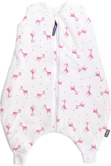 Letní spací pytel pro miminko s otvory pro nohy v bílé barvě s motivem červených žirafek, miminko v něm může volně kopat nožičkami. Délka spacího pytle je cca 70 cm, lze jej prát v pračce při 30 °C. Spací pytel má uprostřed zip a lze jej zcela otevřít, navíc má zip látkovou krytku, která zabraňuje přiskřípnutí krku do zipu. Spací pytel je ušitý ze dvou vrstev: vrchní materiál 100% biobavlna, podšívka 100% biobavlna. Česká výroba.