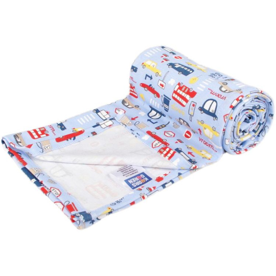 Lehká letní deka pro větší děti, deka je ze 100% bavlny, je modrá s motivem autíček. Rozměr deky je cca 100 x 150 cm, lze prát na 40 °C. Česká výroba.
