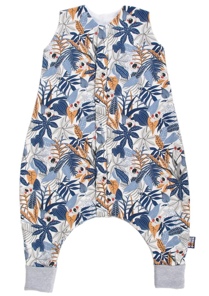 Letní dětský spací pytel s otvory pro nohy v modré barvě s motivem koal, dítě v něm může volně kopat nožičkami. Délka spacího pytle je cca 100 cm, lze jej prát v pračce při 30 °C. Délka spacího pytle odpovídá výšce dítěte k ramenům. Spací pytel má uprostřed zip a lze jej zcela otevřít v obou směrech, navíc má zip látkovou krytku, která zabraňuje přiskřípnutí krku do zipu. Náplet u nožiček lze přehnout a využít jako integrované ponožky. Spací pytel je ušitý ze dvou vrstev: vrchní materiál 100% bavlna, podšívka 100% bambusová viskóza. Česká výroba.