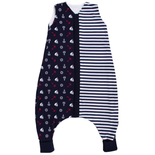 Letní dětský spací pytel s otvory pro nohy v modré barvě s námořnickým motivem, dítě v něm může volně kopat nožičkami. Délka spacího pytle je cca 90 cm, lze jej prát v pračce při 30 °C. Délka spacího pytle odpovídá výšce dítěte k ramenům. Spací pytel má uprostřed zip a lze jej zcela otevřít v obou směrech, navíc má zip látkovou krytku, která zabraňuje přiskřípnutí krku do zipu. Náplet u nožiček lze přehnout a využít jako integrované ponožky. Spací pytel je ušitý ze dvou vrstev: vrchní materiál 100% bavlna, podšívka 100% bambusová viskóza. Česká výroba.