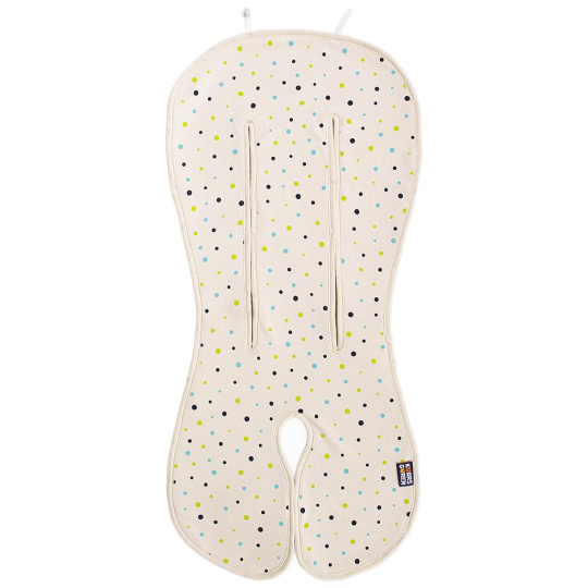 Letní univerzální vložka do všech typů kočárků s otvory pro protažení bezpečnostních pásů, velikost cca 38 x 82 cm. Vložka pasuje i do všech dětských autosedaček velikosti 0+ (0 až 13 kg), lze použít i v autosedačkách velikosti 1 (9 až 18 kg). Vrchní strana je ze 100% bio-bavlny s motivem puntíků. Spodní strana je ze 3D polyesteru, který zajistí proudění vzduchu. Praní na 30 °C. Vyrobené v České republice.